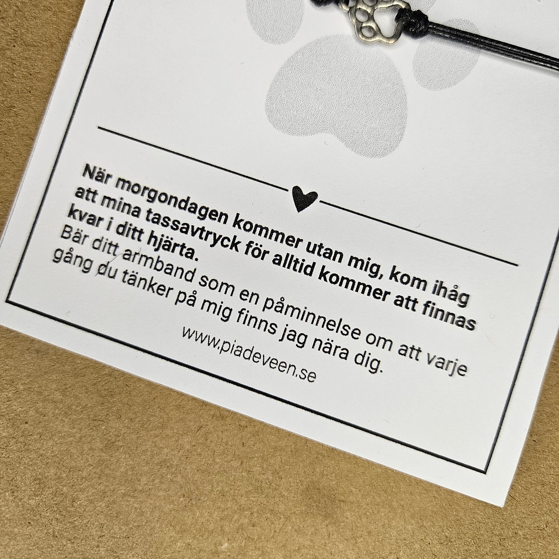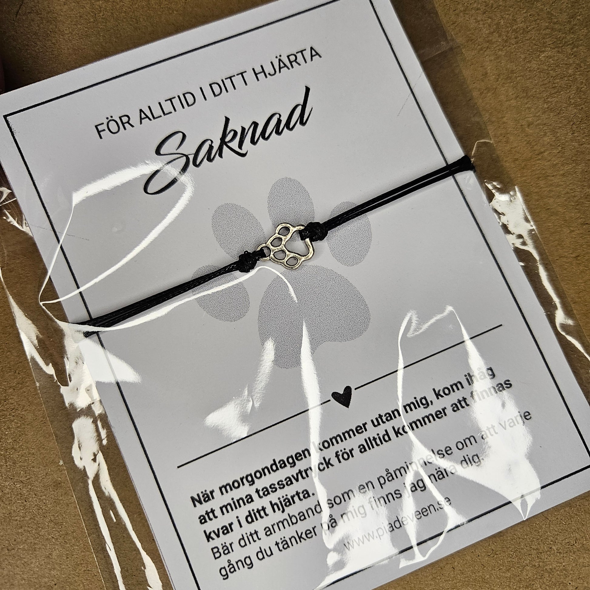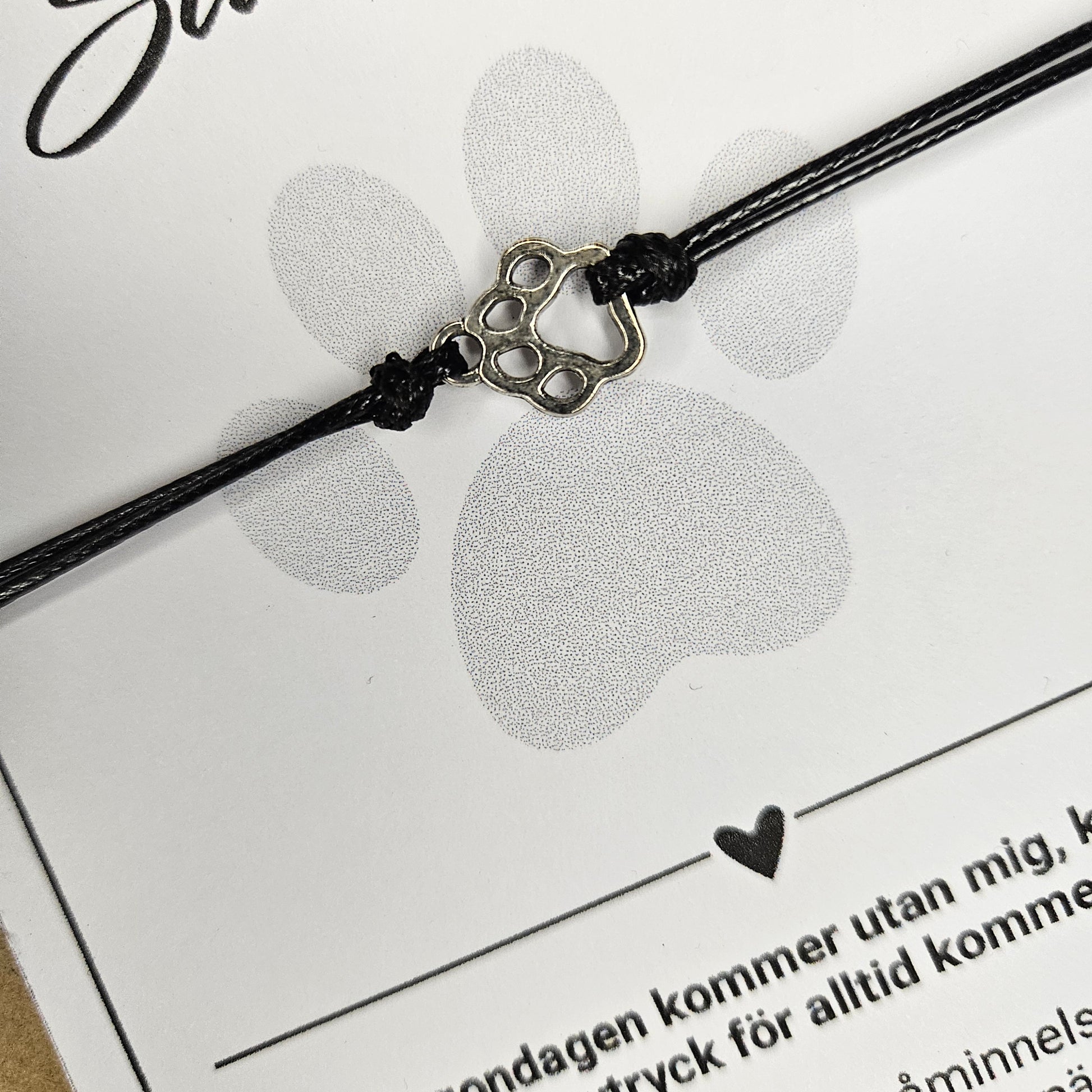 Armband på smyckeskort. Saknad och för alltid i mitt hjärta. Omtänksam present till den som just förlorat sin pälskling. En liten tass i rostfritt stål och svart band. Bär den till minne av din pälskling. Armbandet går att justera.