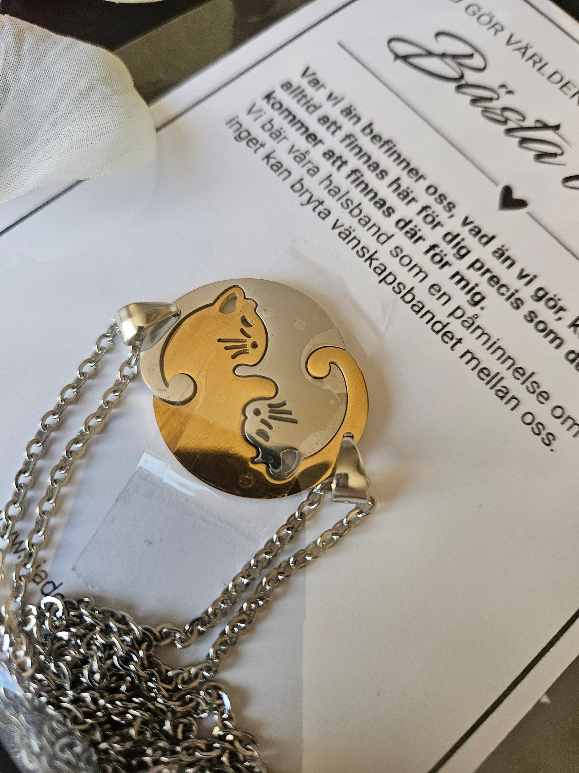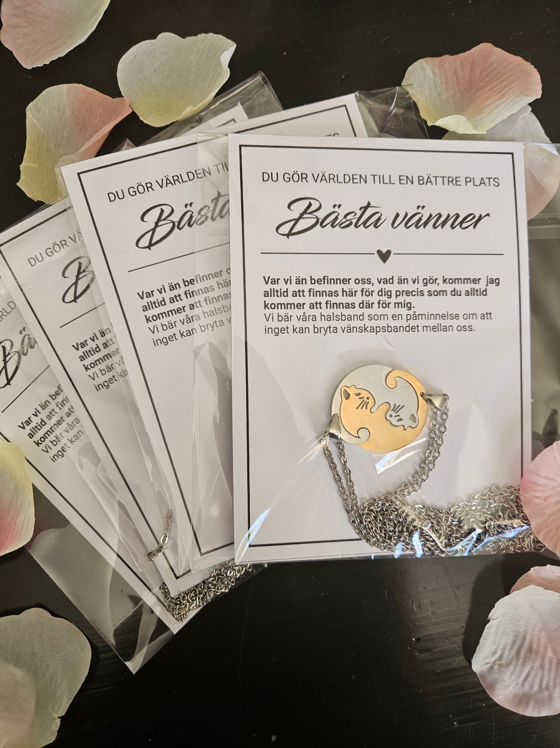 Text på kortet; "Var vi än befinner oss, vad vi än gör, kommer jag alltid att finnas här för dig precis som du alltid kommer att finnas där för mig. Vi bär våra halsband som en påminnelse om att inget kan bryta vänskapsbandet mellan oss."