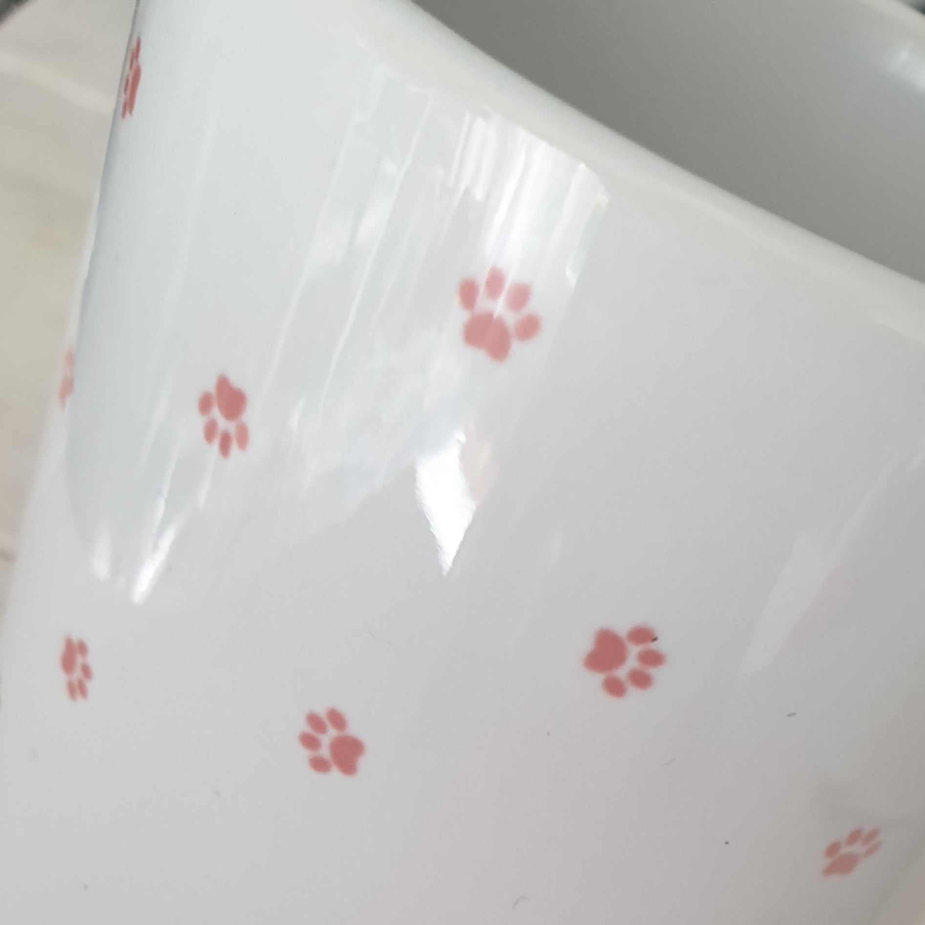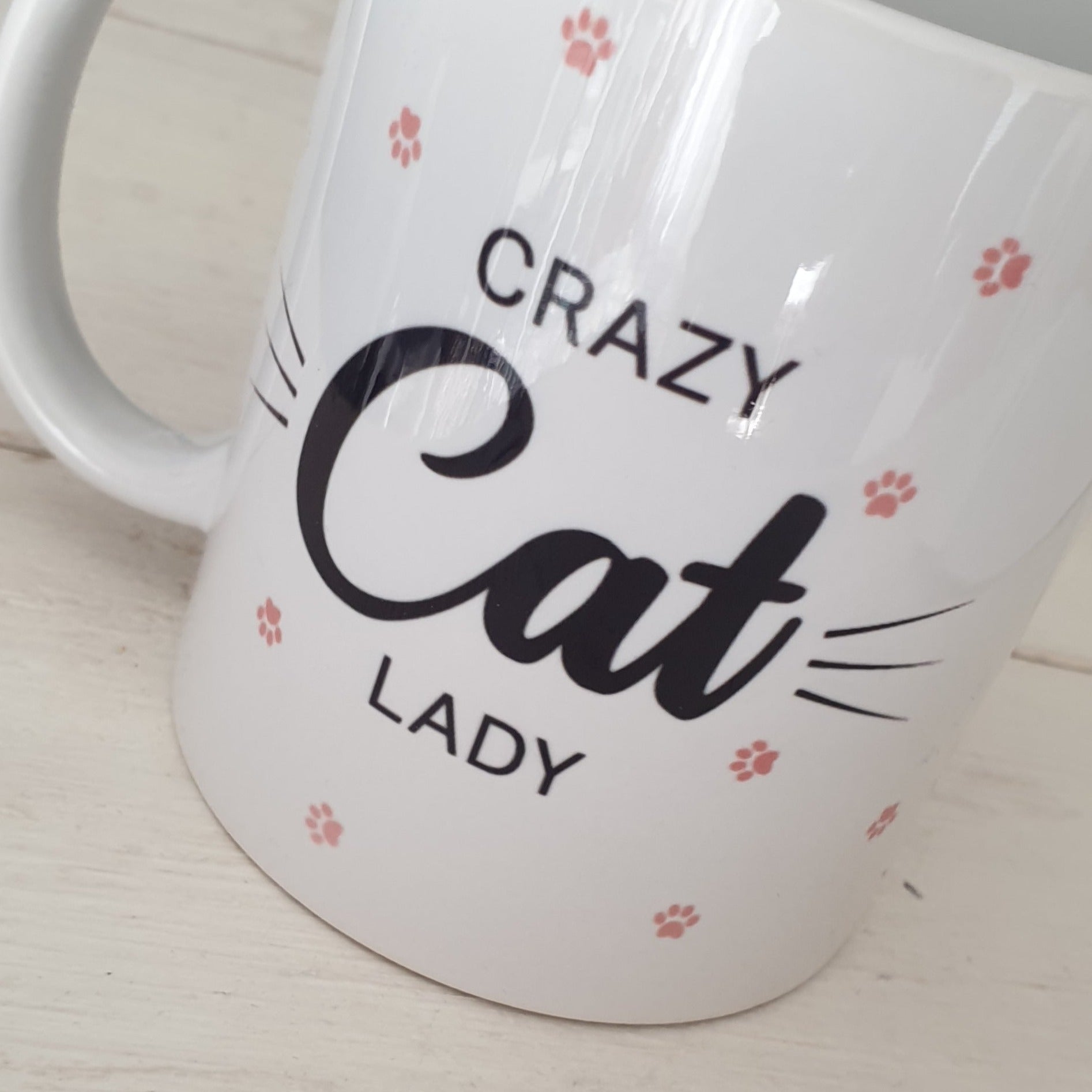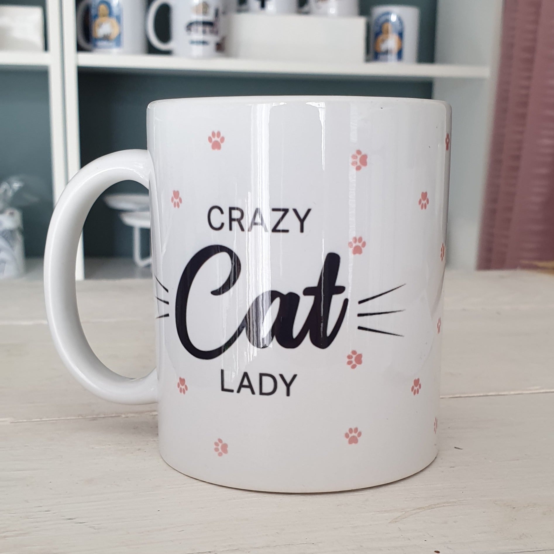 Mugg med en illustration med texten Crazy cat lady och med små rosa, söta kattassar som dekoration runt muggen.