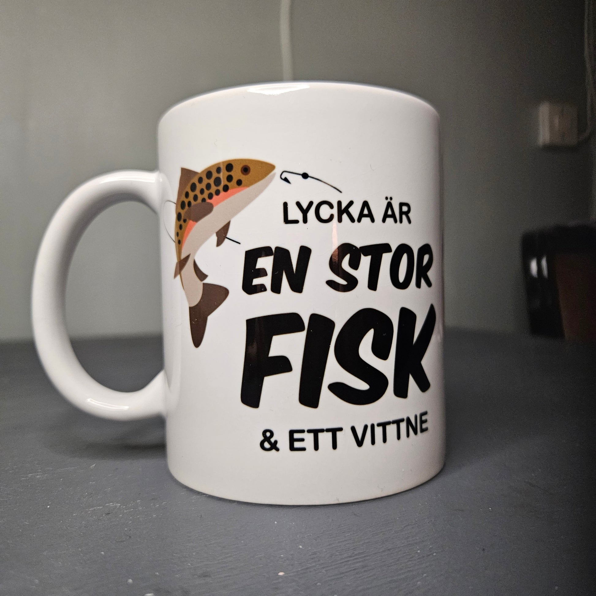 Mugg med texten: Lycka är en stor fisk och ett vittne.