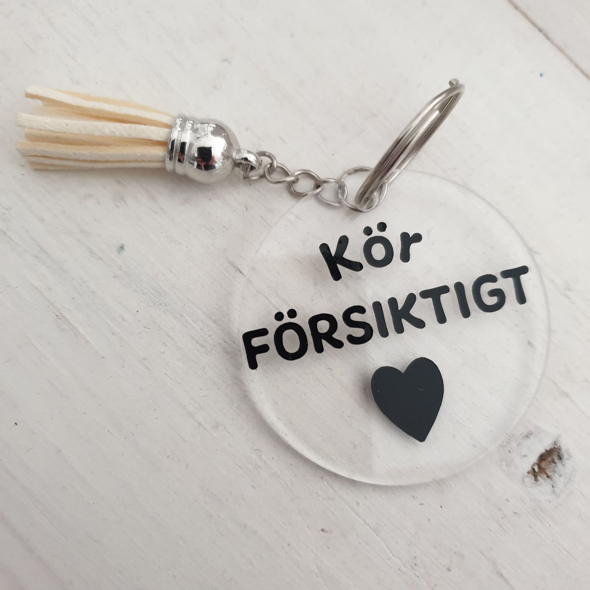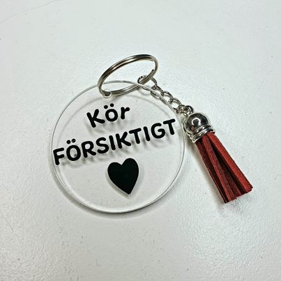 Nyckelringmed texten, Kör försiktigt! Utskuren text av folie på plexiglas. Omtanke om den som du tycker allra mest om eller kanske en nybliven körkortsinnehavare?