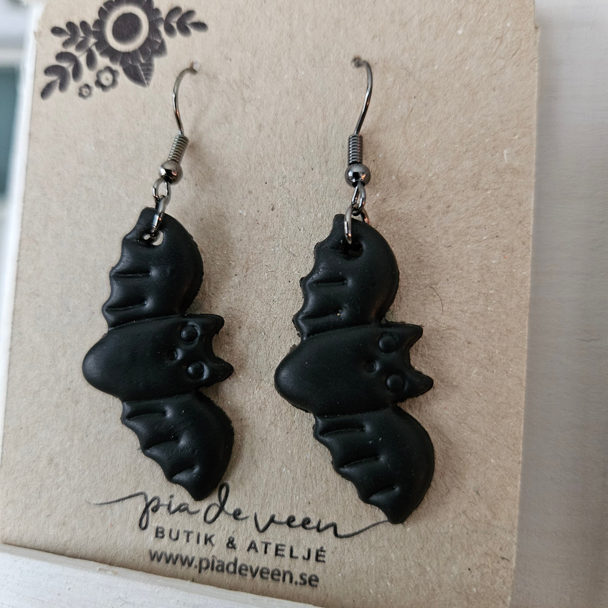 Svarta små fladdermöss. Väldigt lätta att bära då de knappt väger någonting! Dessa örhängen är handgjorda i fimolera.