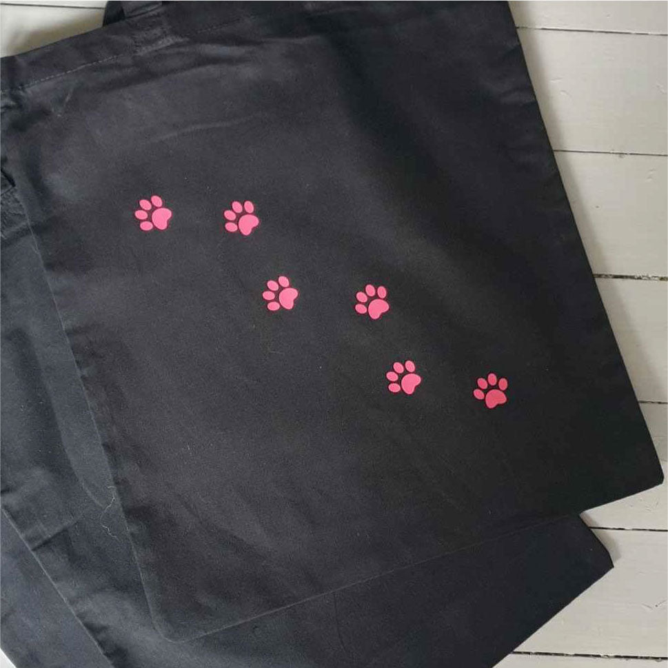 För dig som gillar katter. Kassen har tryck på båda sidor. På baksidan har det tassat en katt och lämnat rosa tassavtryck.